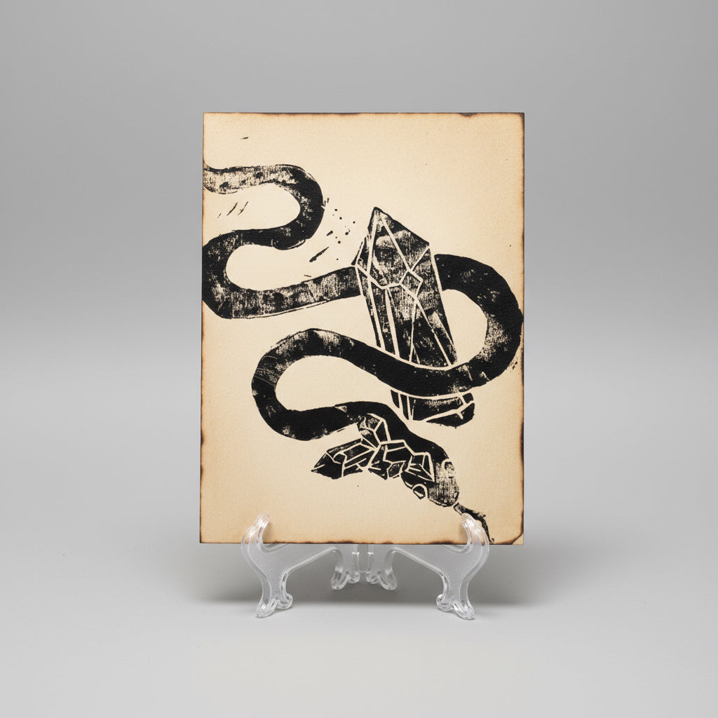 A hand-carved linocut print featuring a playful snake wrapped up in sparkling crystals. Bold, expressive linework brings this whimsical composition to life.