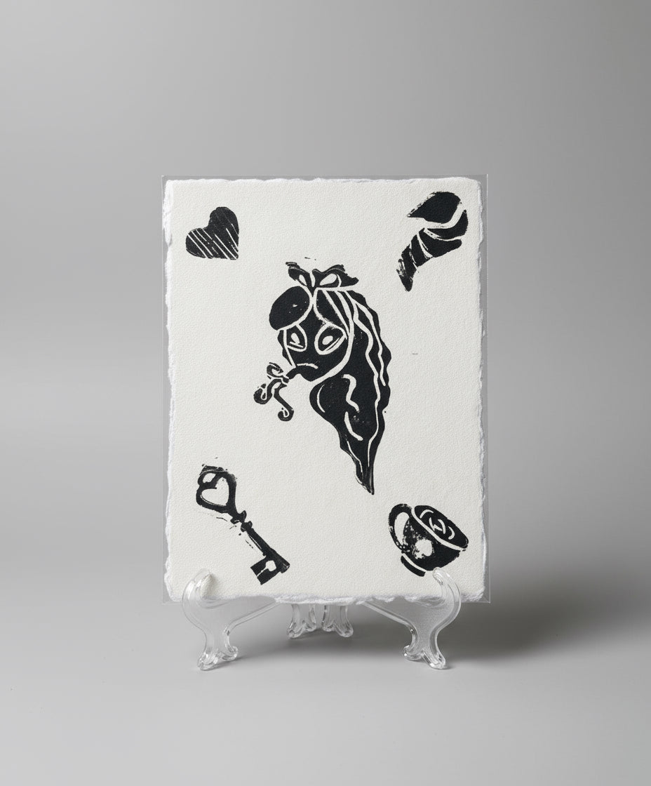 Step into a cosmic twist on a classic tail. This linocut print features an Alien Alice surrounded by whimsical Wonderland-inspired elements.