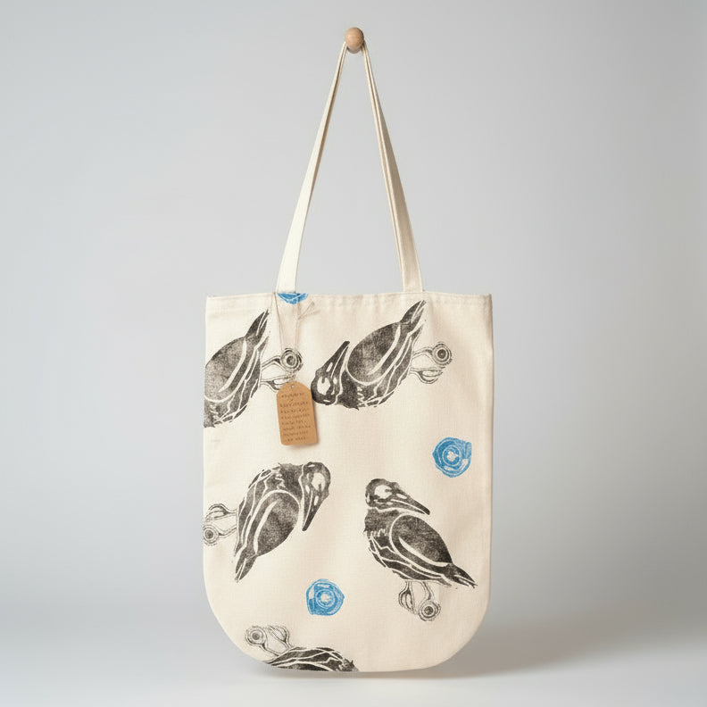 Hand-sewn cotton with a playful raven and eyeball linocut design, perfect for carrying your essentials in style. Slight variations in the seams add to its handmade charm.